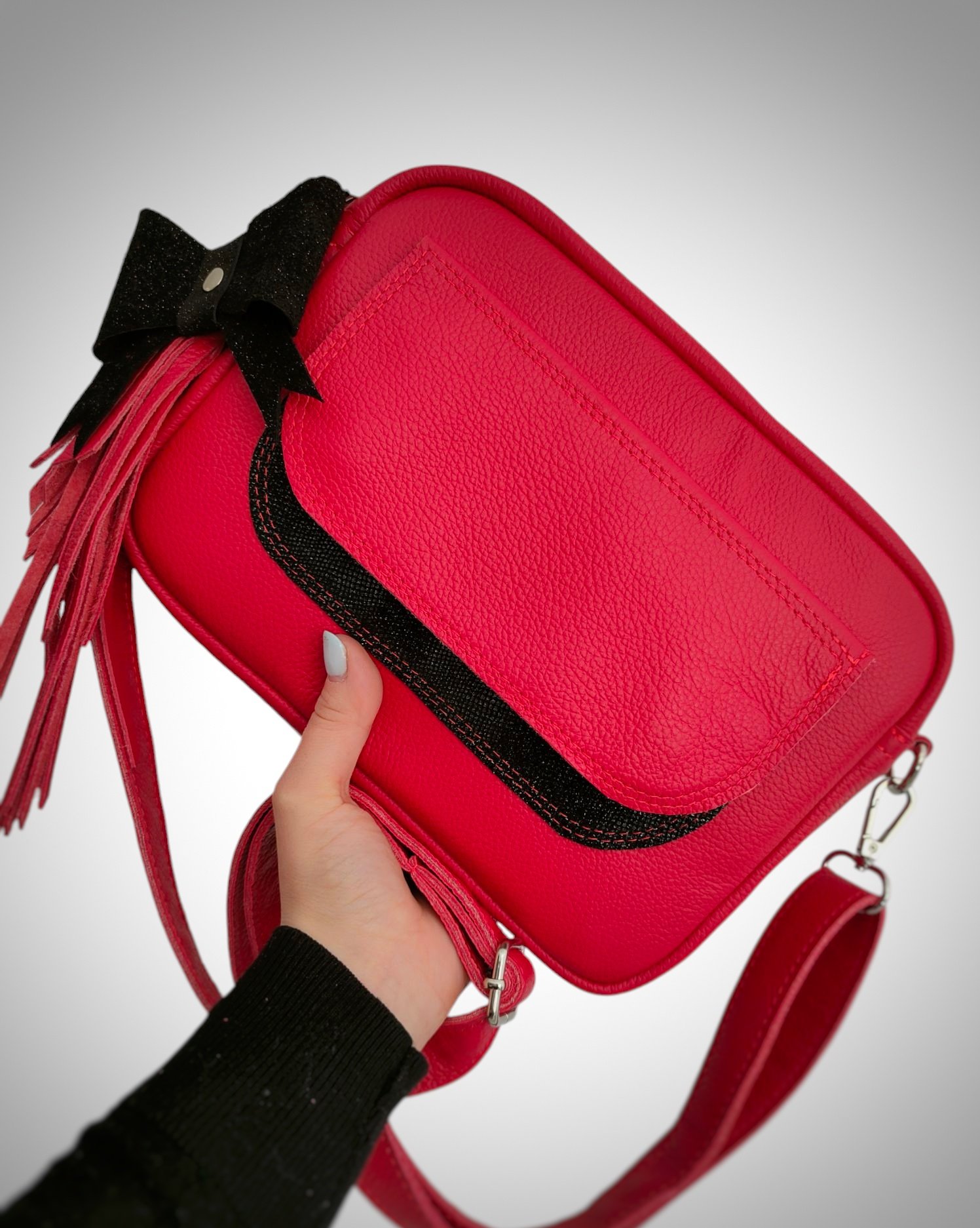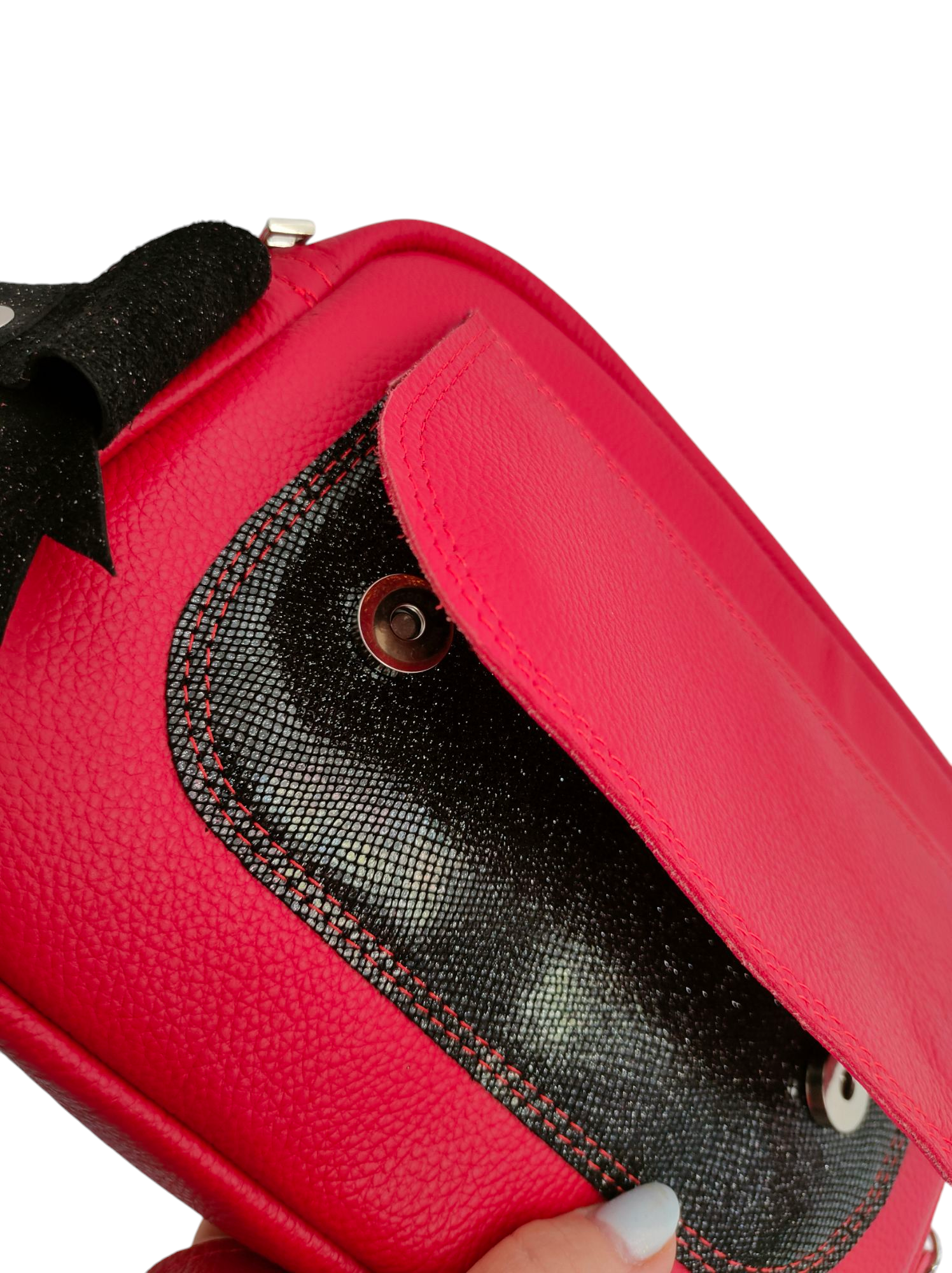 *Box skórzany z klapką intensywna czerwień/czarny brokat