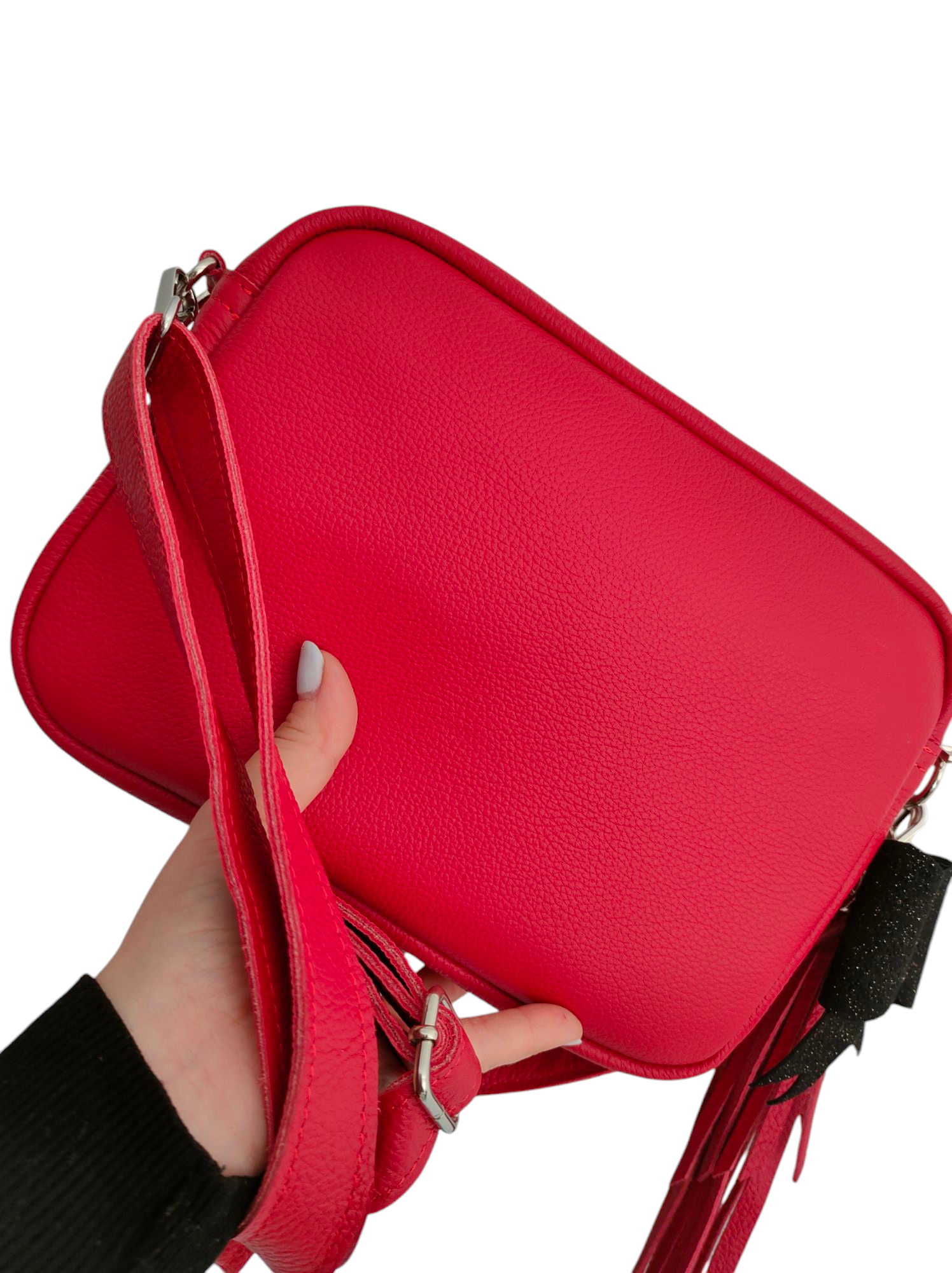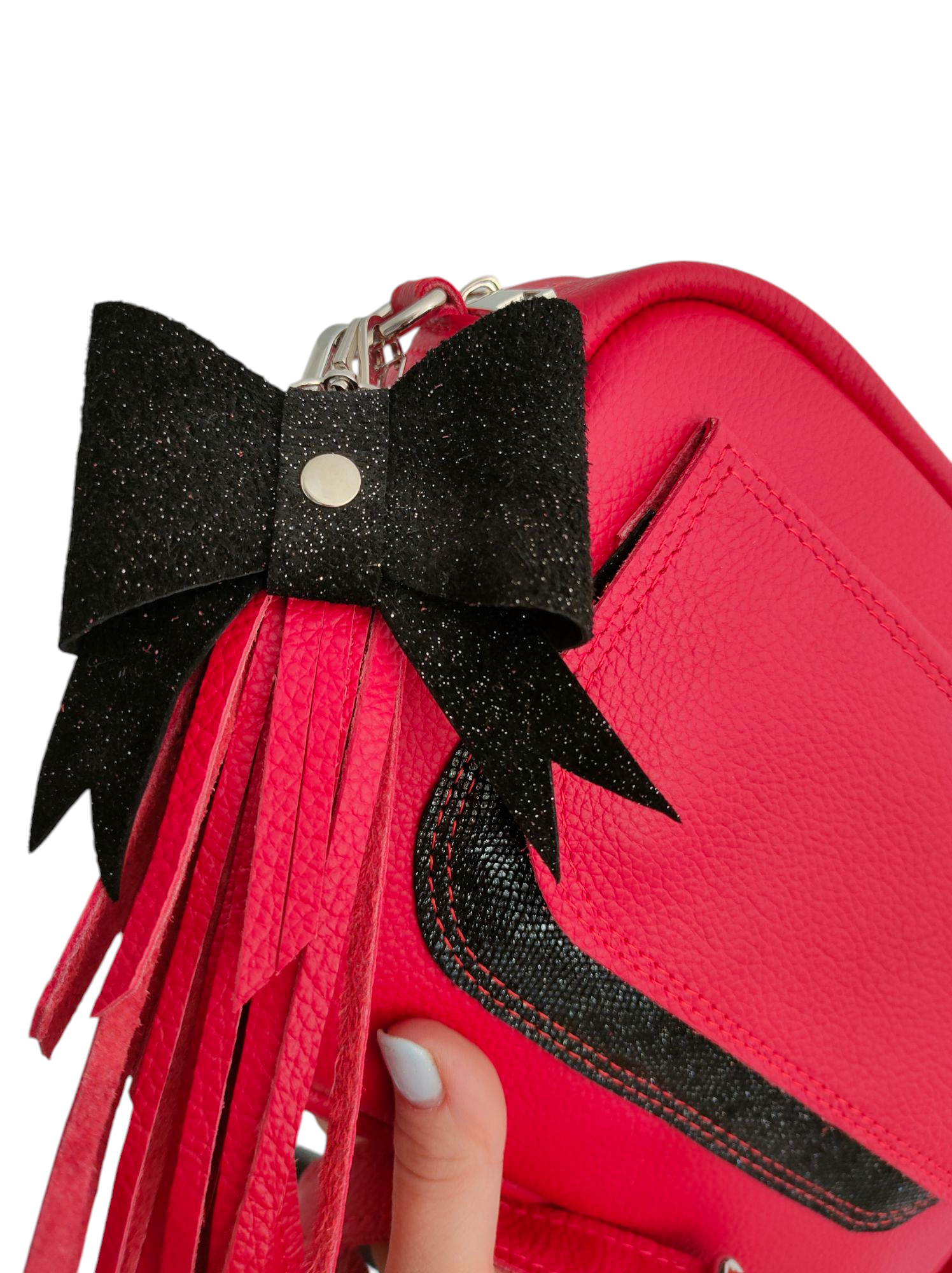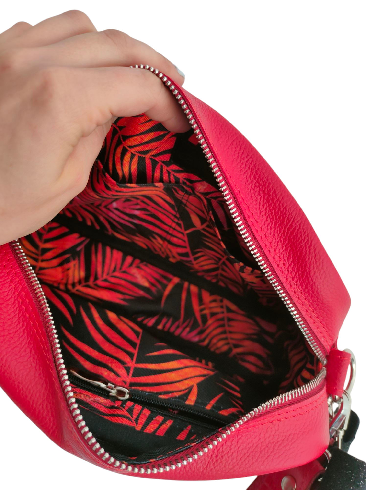 Torba o wymiarach około 26/19/8 cm. Wykonana ze skóry naturalnej w kolorze czerwonym z dodatkiem czarnej brokatowej.