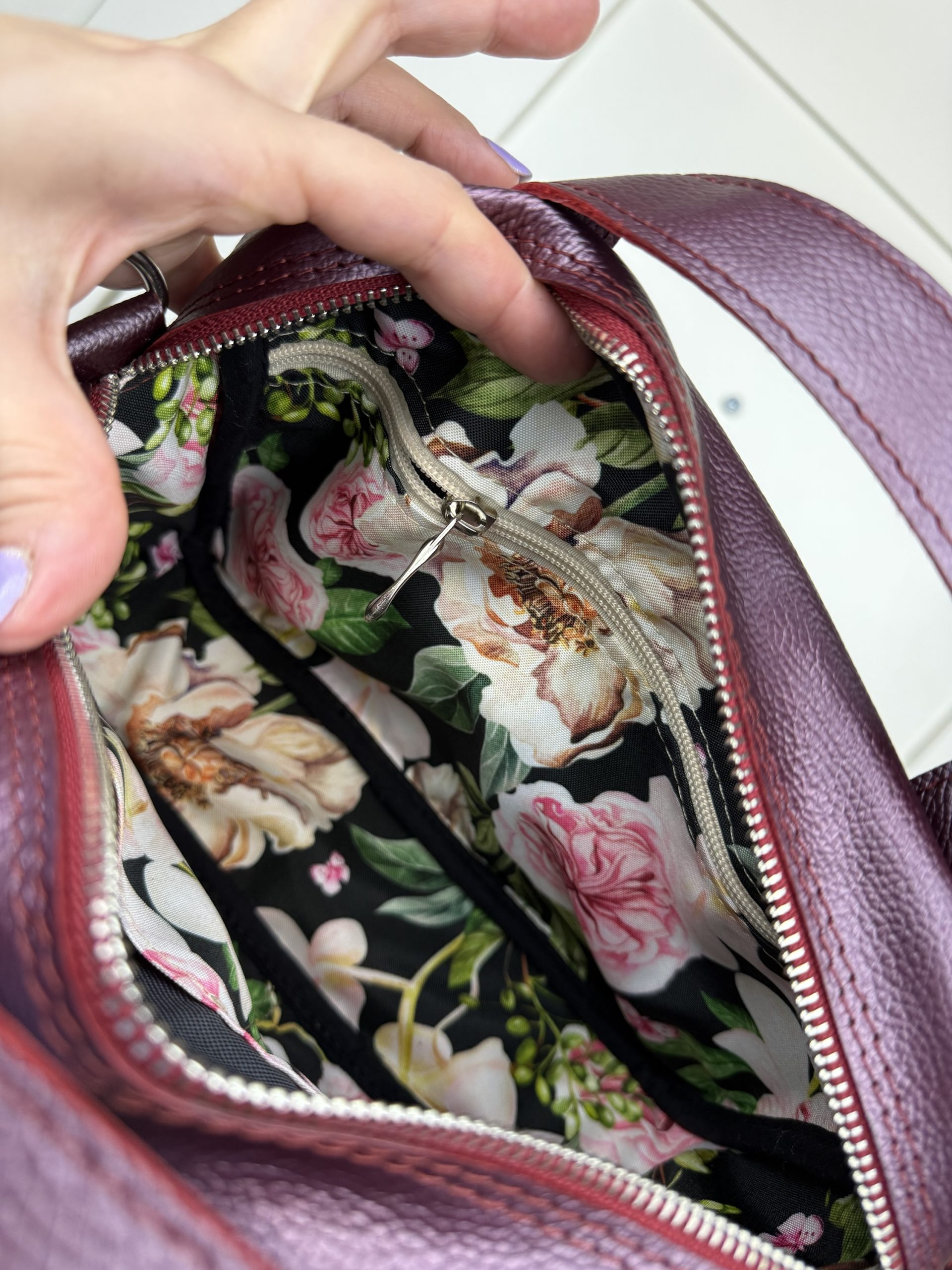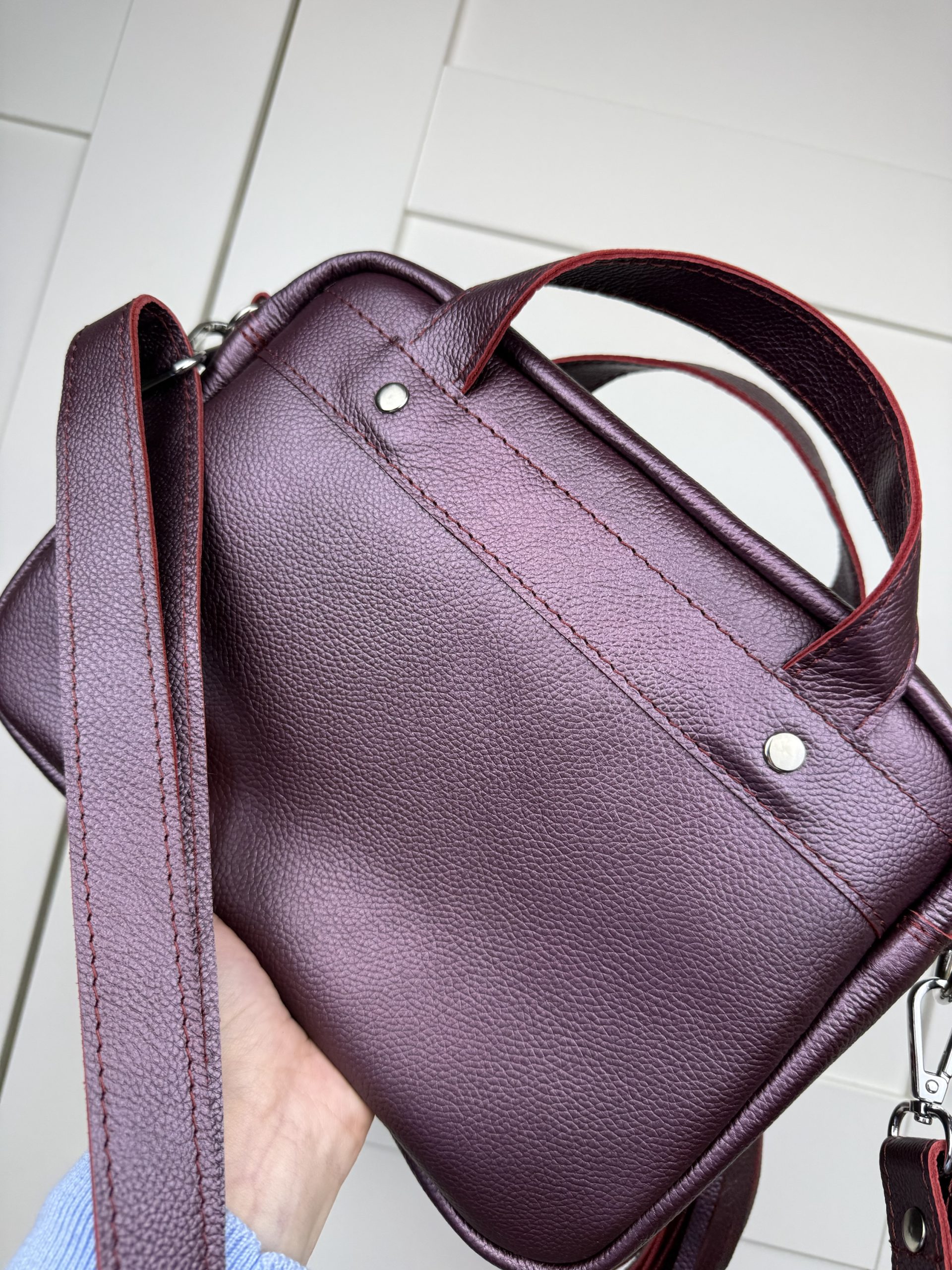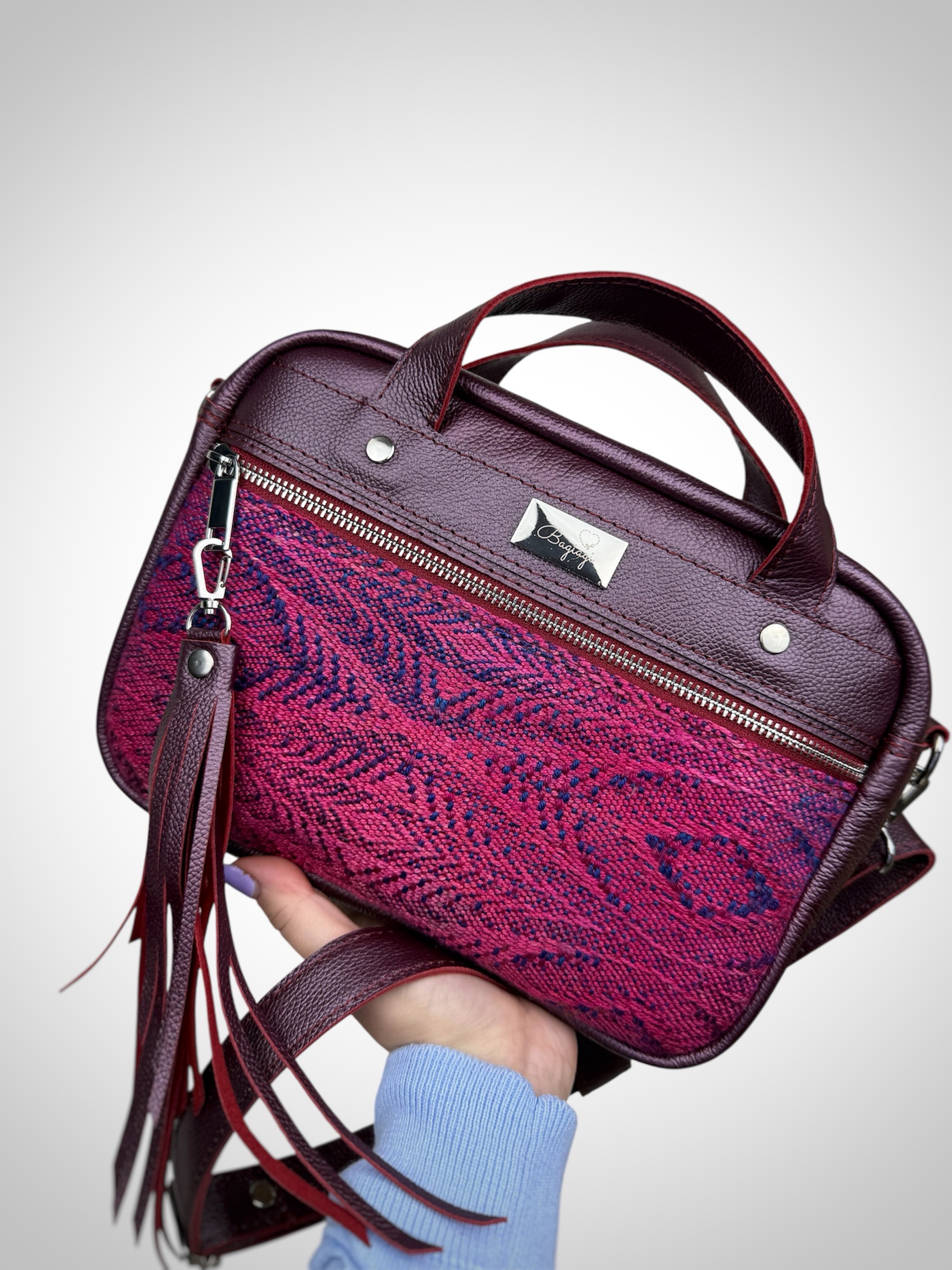 Torba o wymiarach 26/19/8 cm, wykonana z naturalnej skóry w kolorze bordo/perly oraz skrawka chusty ręcznie tkanej.