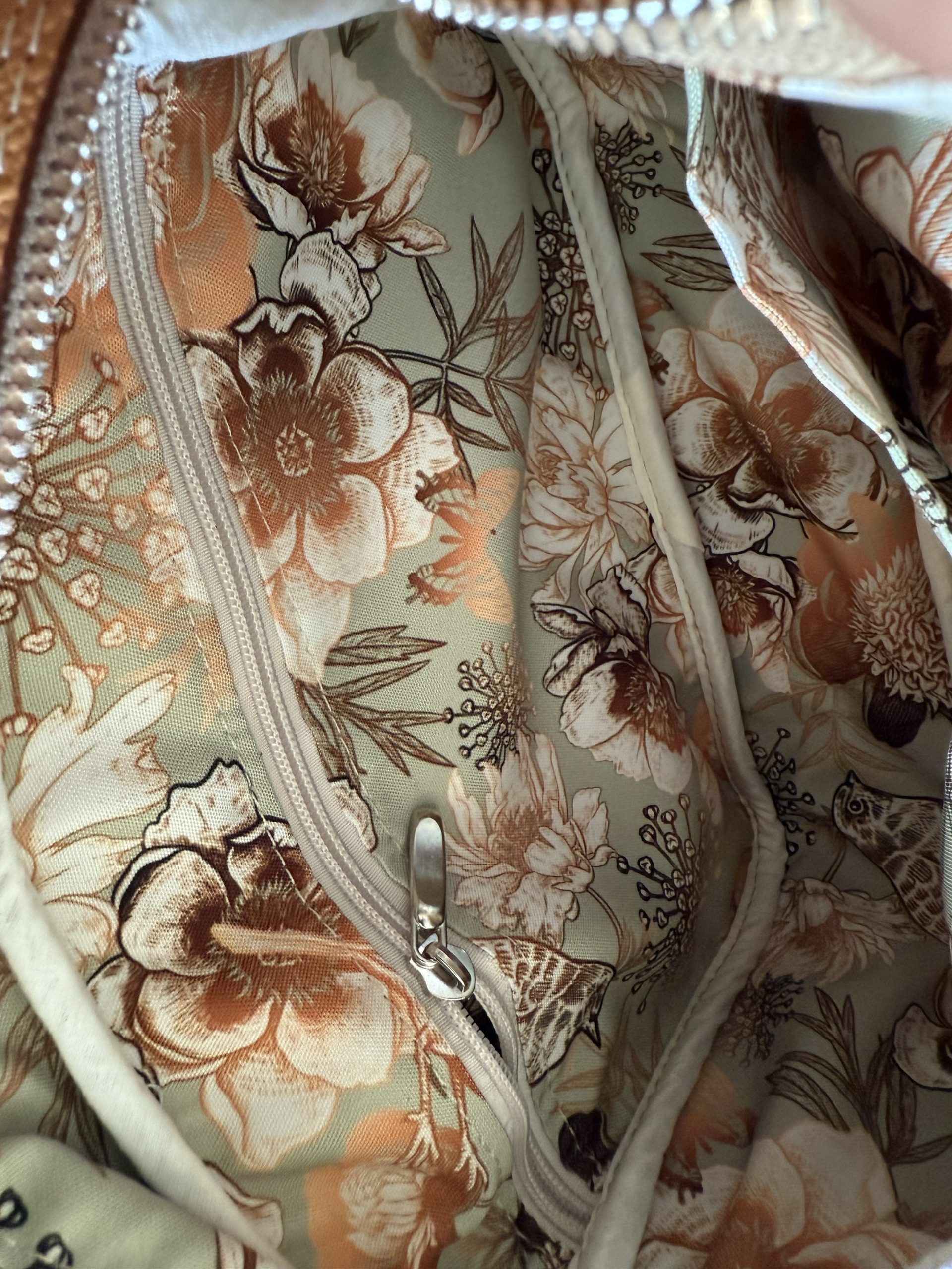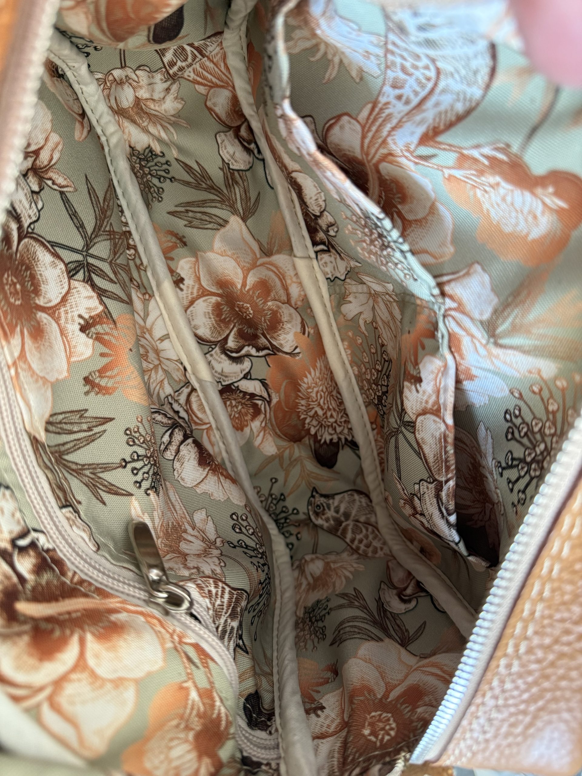 Wewnątrz kieszeń na zamek oraz dwie kieszenie wsuwane, podszewka wodoodporna