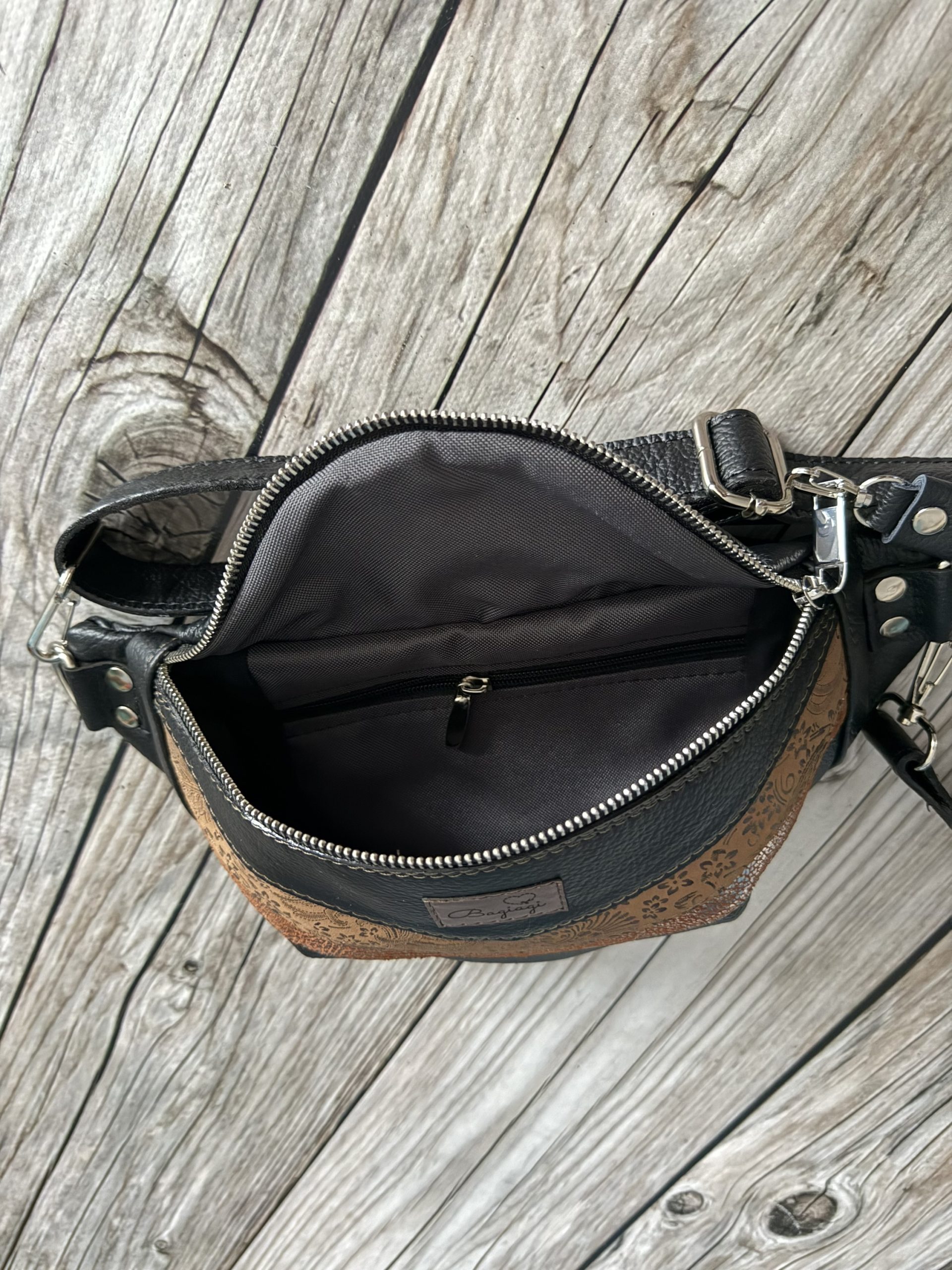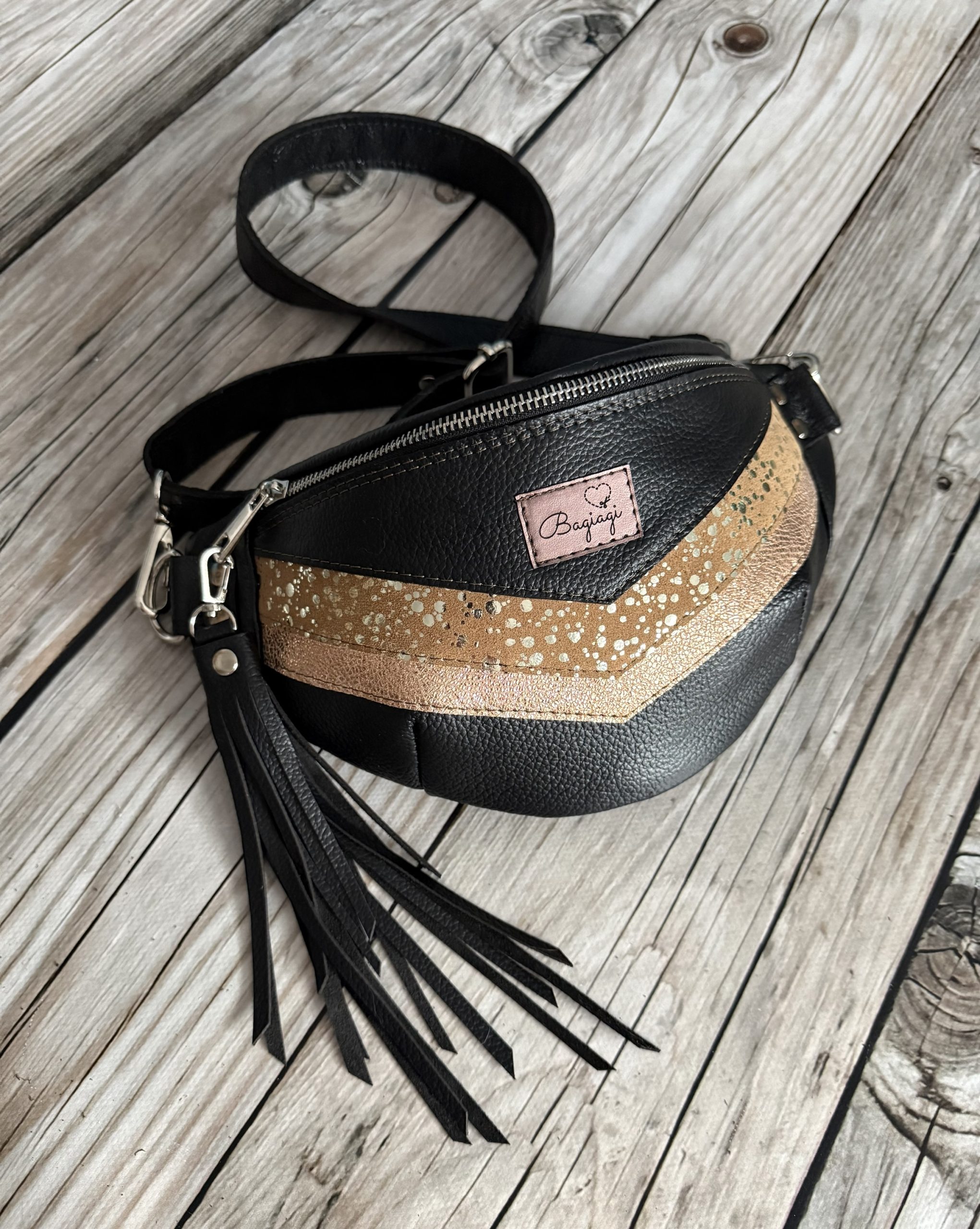 Saszetka o wymiarach 29/15/9 cm z kieszenią wewnątrz na zamek. Wykonana ze skóry naturalnej. Pasek z regulacją około 90/120 cm obwodu. Chwost w zestawie. Przykładowe wnętrze w galerii
