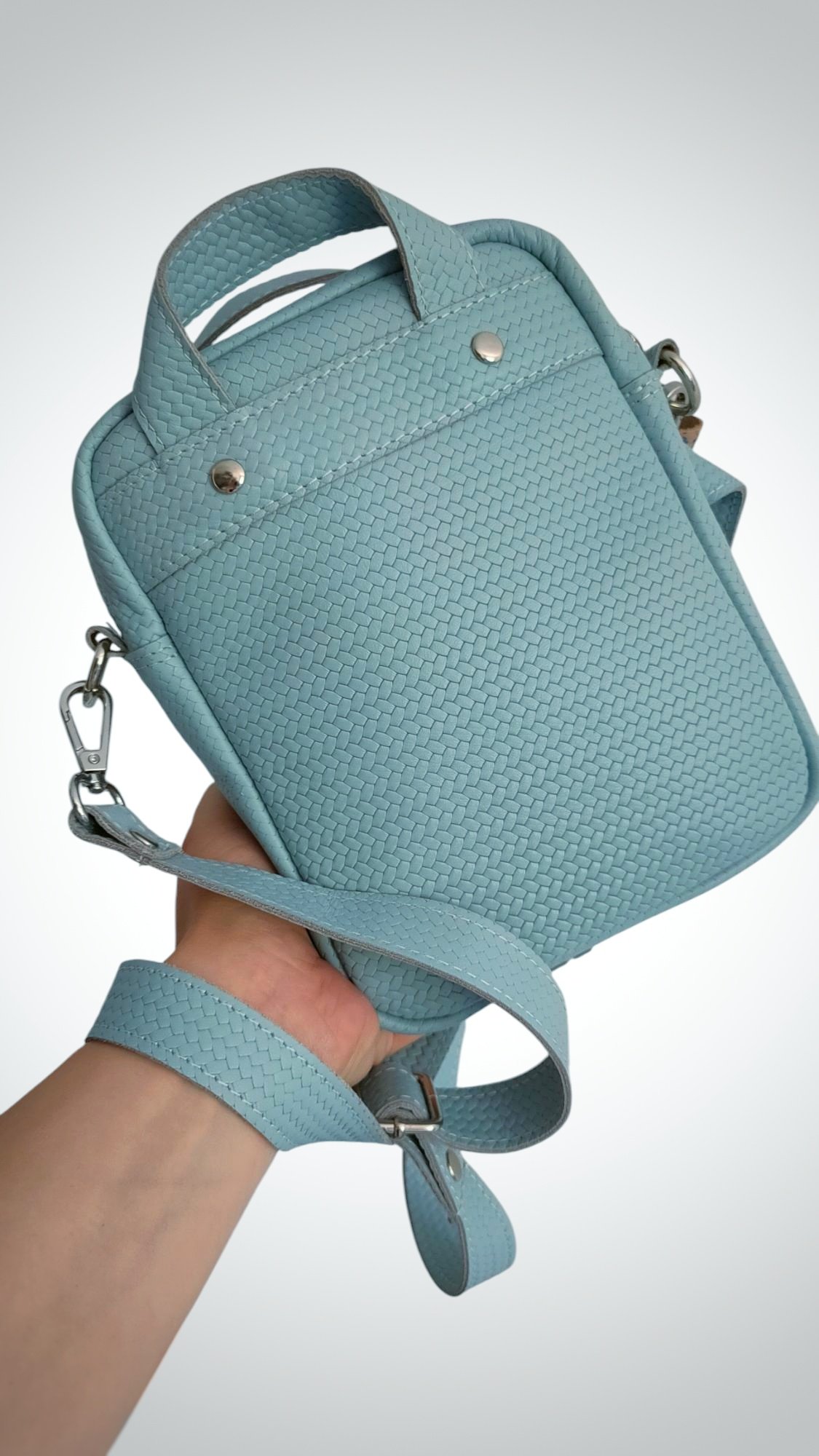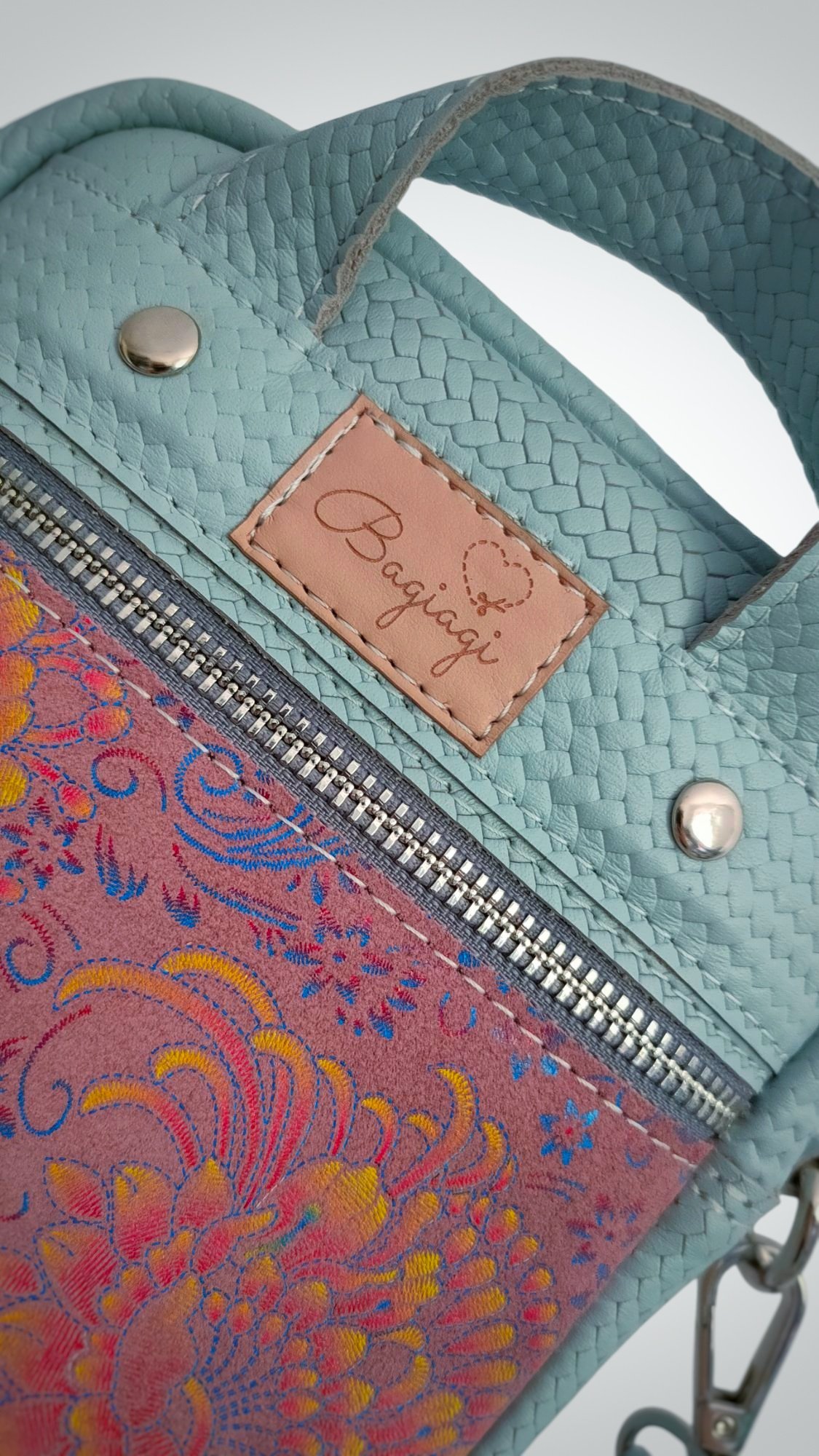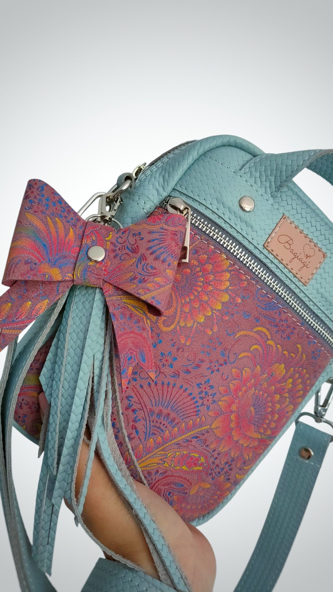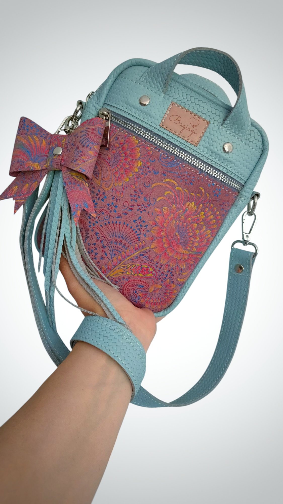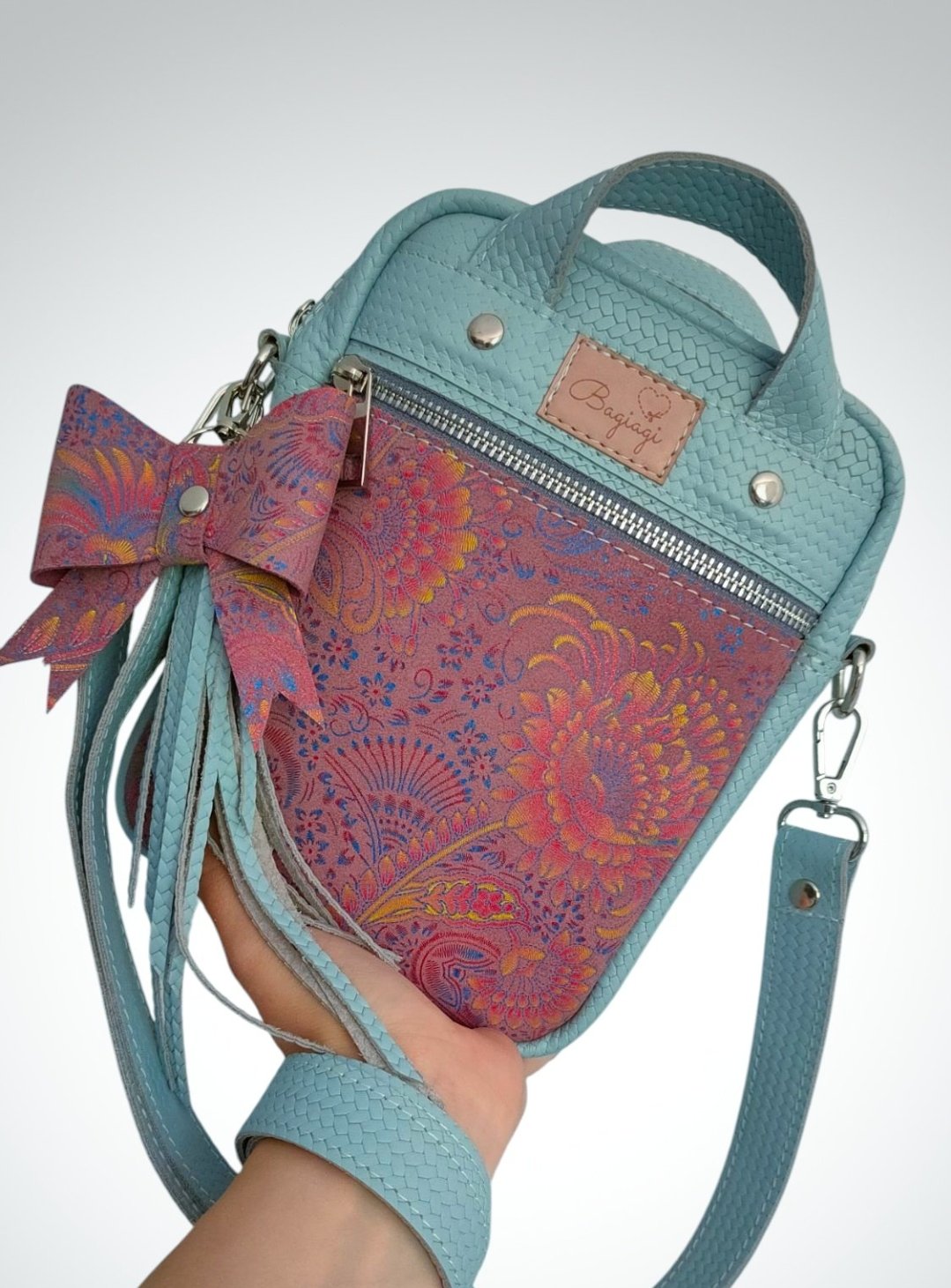 Saszetka wykonana ze skóry naturalnej w kolorze jasnego błękitu z dodatkiem pastelowego Paisley.