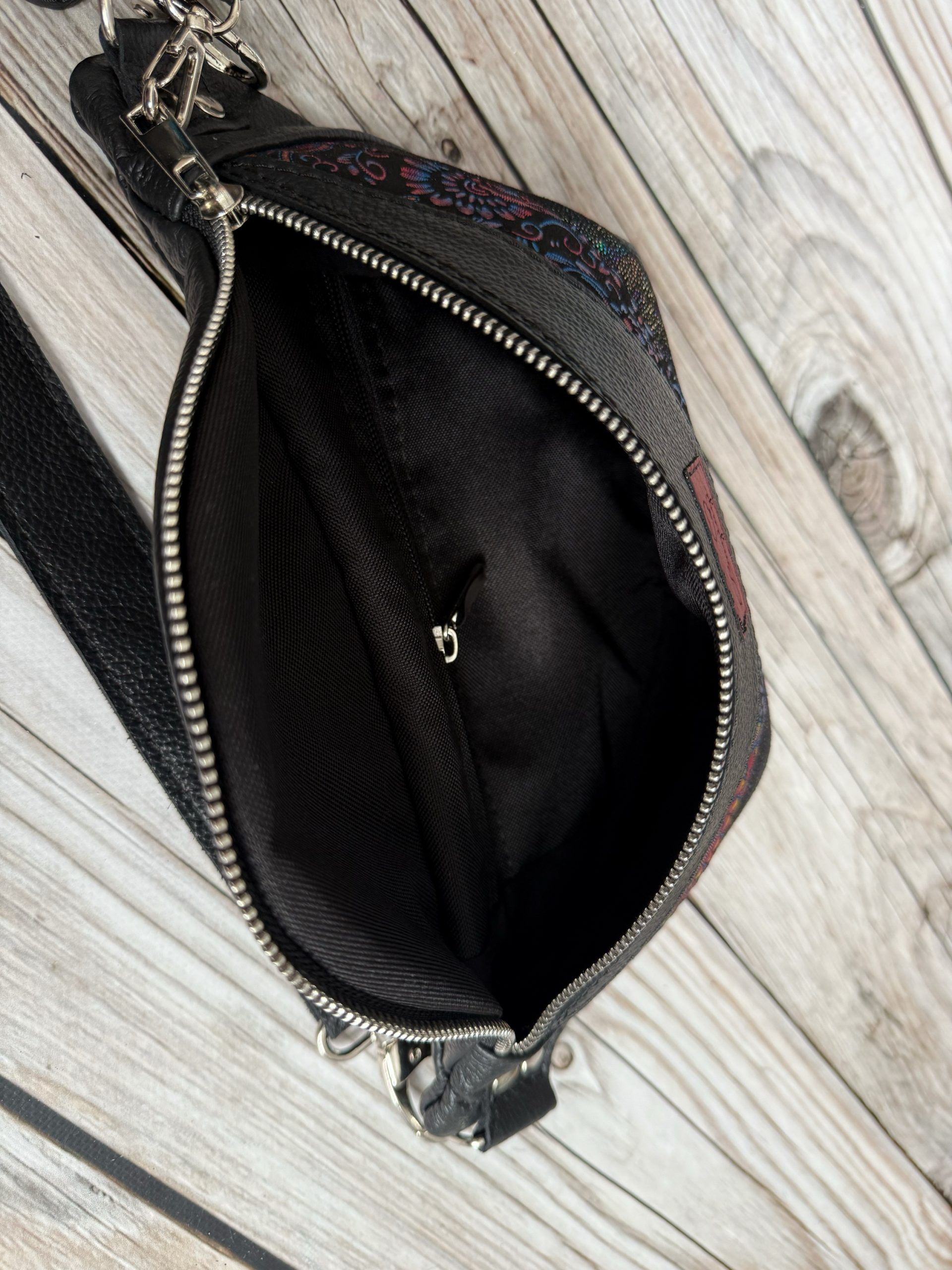 Saszetka o wymiarach 29/15/9 cm z kieszenią wewnątrz na zamek. Wykonana ze skóry naturalnej. Pasek z regulacją około 90/120 cm obwodu. Chwost w zestawie. Przykładowe wnętrze w galerii