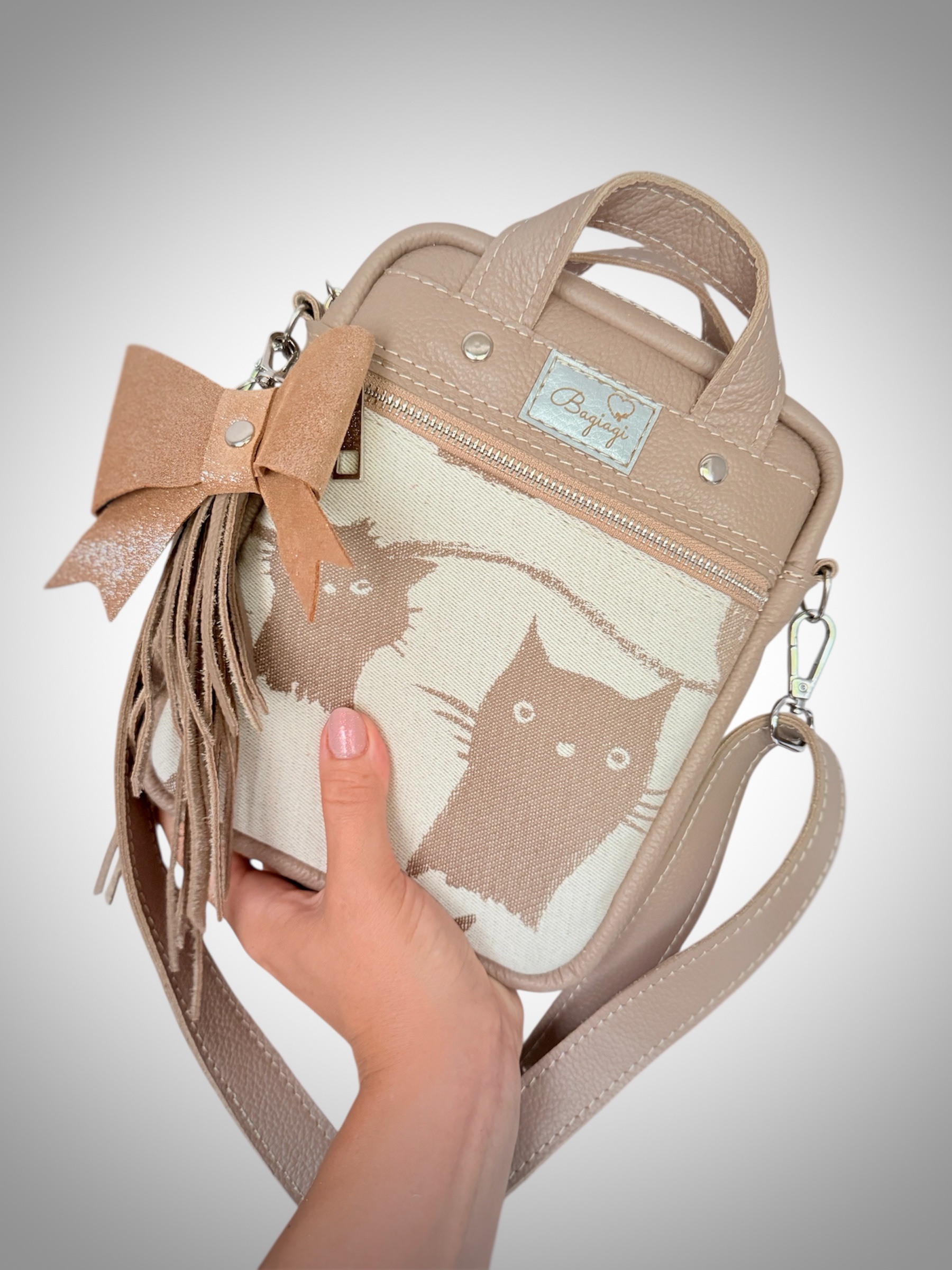 Saszetka wykonana ze skóry naturalnej w kolorze beżowym z dodatkiem skrawka chusty do noszenia dzieci.